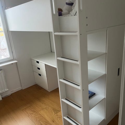 Mio loftsäng i vit färg. Sängen är upphöjd med en stege på sidan och har ett öppet utrymme under som kan användas till exempelvis skrivbord, förvaring eller lekyta. Stabil konstruktion i trä/träliknande material med skyddskant runt madrassen upptill. Passar ett standardmått på enkelsängsmadrass.