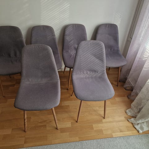Matstolar i trä med vit lackad stomme och vit stoppad sits.