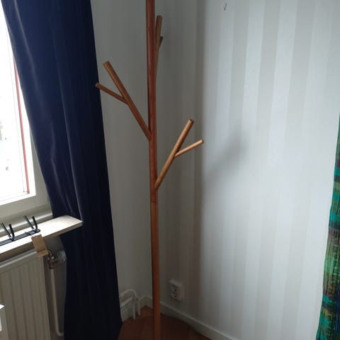 Hay klädhängare i svart metall. Fristående modell med enkel, rektangulär ram för upphängning av kläder på galgar. Passar för användning i hall, sovrum eller klädkammare för förvaring och organisering av kläder och ytterplagg.
