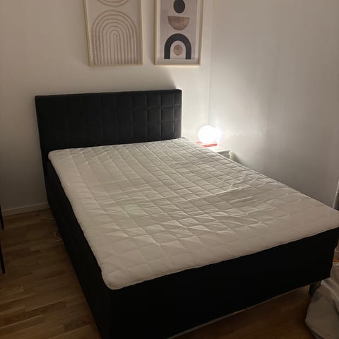 IKEA sänggavel i tyg något solblekt, se bilder. Klädseln är avtagbar. Sänggaveln står på svarta ben och har en rak, vadderad front. Baksidan är klädd i samma tyg. Passar som huvudgavel bakom säng och kan användas för att ge stöd bakom kuddar samt skydda väggen.