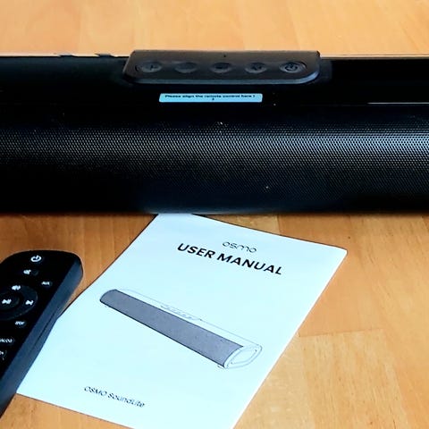 Produkten är kompakt och kan placeras framför tv:n eller på en tv‑bänk. Medföljande fjärrkontroll (enligt bild) används för att justera volym och andra grundläggande funktioner. Lämplig för vardagsrum, sovrum eller andra mindre till medelstora rum där man vill ha bättre ljud än tv:ns inbyggda högtalare.