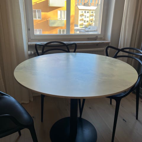 Unikt matbord i ek. Tillverkat på Öland. 148 cm i diameter och 74 cm högt. 8 stolar får plats runt bordet utan problem. Finns att hämta i Påskallavik.