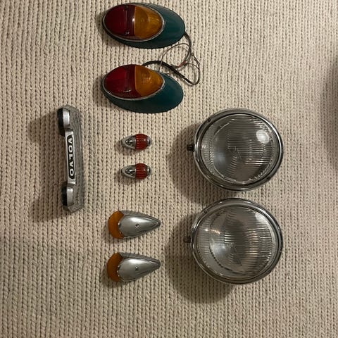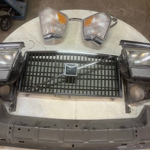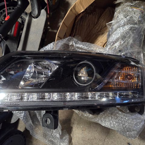 Strålkastare vänster Volvo. Kolla på bilder för att se vad som ingår. Runt lock till blinkers sida fattas.