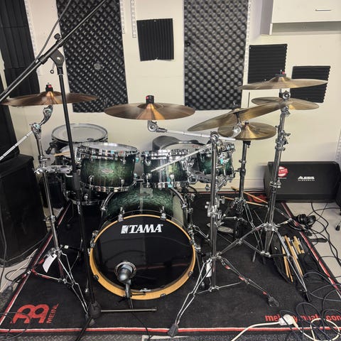 Gretsch trumset 70-tal i vitt utförande. Setet består av bastrumma, hängpuka, 2 golvpuckor. Soft case-ar kommer med.