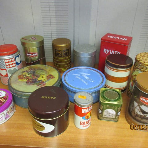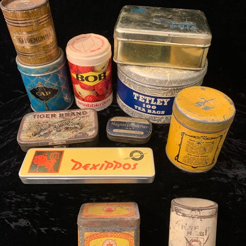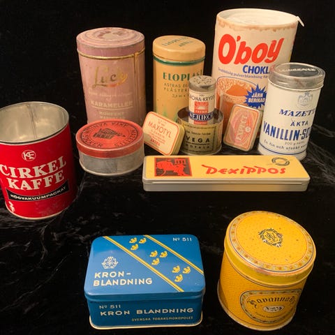 En samling gamla burkar i plåt och papp. Blandat skick