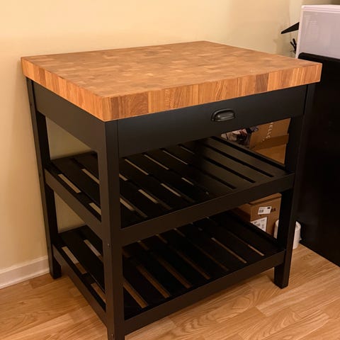 Marbodal köksö i trä med kraftig skiva och underrede i massivt trä. Tydligt använd med lite såg och borr hål i. MEN bra arbetsbord då den är väldigt stabil alt om man vill slipa och olja in går den att få fin igen.