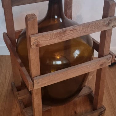 Stor flaska med patent kort och trä kagge veldig fint.