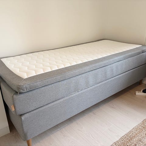 90-säng i grått tyg. Sängen är en enkelsäng med träram och ben i trä. Överdelen har en quiltad, grå bäddmadrass. Passar som vanlig säng i sovrum eller gästrum. Vi har haft den som gästsäng, men det blev inte så mycket gäster, så den är knappt använd.