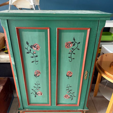 Skåp i trä med två dörrar. Framsidan har ett dekorativt blommotiv i flera färger, inramat av gröna och mönstrade kanter. Skåpet är mörkt målat på sidor och ovansida, med tydligt slitage i färgen som ger ett patinerat utseende. Passar som förvaringsmöbel i vardagsrum, hall eller sovrum eller studio.