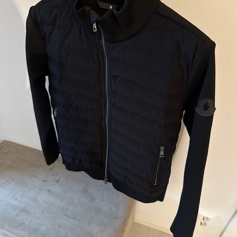 Moncler jacka för herr i storlek S. Jackan är svart och vadderad med dun på fram- och baksida. Modellen har dragkedja framtill och huva med dragsnören. Ärmarna är i stickad textil med kontrastdetalj och Moncler-logga på ena ärmen. Passar som ytterplagg under svalare väder.