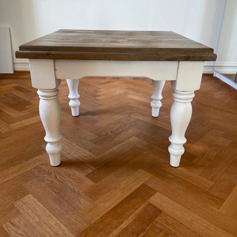 Mio soffbord i trä med brun bordsskiva och vit underdel. Bordet har kraftiga svarvade ben och rektangulär form. Design av Aage Petersen. Passar som soffbord i vardagsrum eller allrum.