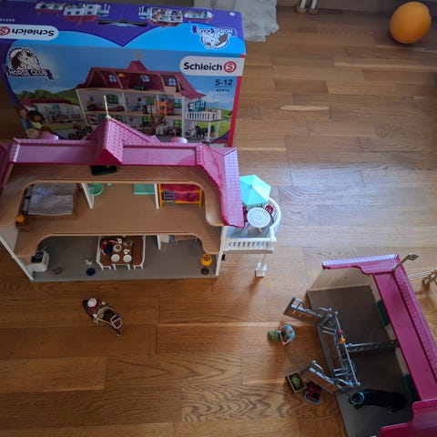 Schleich hästgård med boningshus, stall och djurhotell. I setet ingår flera figurer och djur, bland annat människor (4 st), hästar (2 st) och andra gårdsdjur (2 hundar, 4 katter, 1 kanin). I övrigt kan det saknas enstaka små delar till setet.