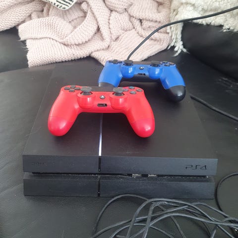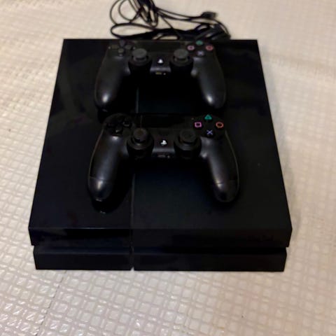 Playstation 4 komplett med kontroll och samtliga kablar. En väldigt liten gummibit har lossnat på kontrollen (inget som stör spelandet). Fungerar utmärkt!