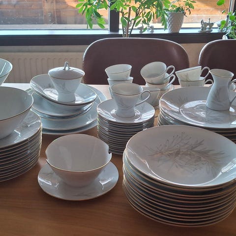 Rosenthal porslinservis i vit färg med blått blommönster. Servisen består av flera delar, bland annat tekanna, sockerskål, koppar med fat, tallrikar och ljusstakar. Blå blomdekorationer på samtliga delar. Passar för servering av varma drycker, dessert och måltider samt dukning vid bord. Exakt antal delar och mått kan kontrolleras vid intresse.