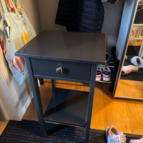Sängbord i mässing med grå/rökfärgad glasskiva.