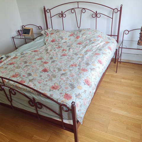 Fin gammal sängstomme med tillhörande nattduksbord i trä och mässing. Troligen från 60- eller 70-talet och i bra skick för sin ålder.