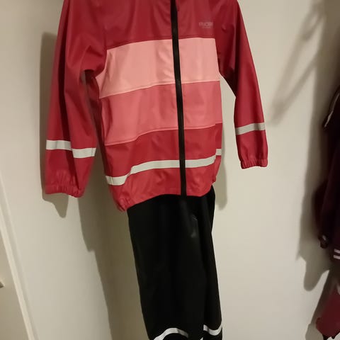 Nytt rosa regnställ, jacka + byxor i storlek 122-128. (Strova). (Köpt fel storlek).