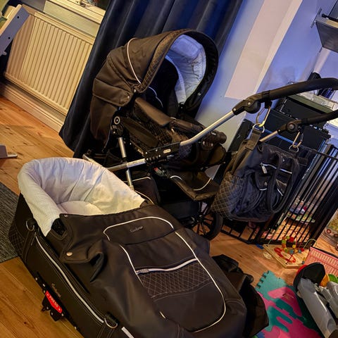 Ligginsatsen är oanvänd. Sittdelen är fräsch och väl omhändertagen. Vagnen är stabil, trygg och rullar mycket fint. Emmaljungas kvalitet märks direkt – rejäl konstruktion, bra fjädring och hög komfort för barnet. Väldigt skön och mysig att köra runt, stabil och bra.