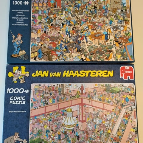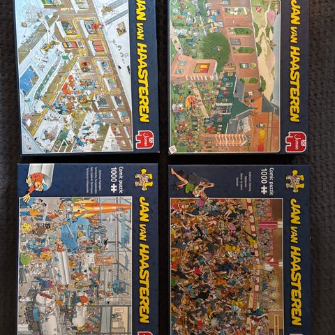 Jan van Haasteren pussel med 1000 bitar. Flera olika motiv i färgstark tecknad stil. Pusslen passar för vuxna och äldre barn som gillar detaljrika och humoristiska bilder. Levereras i originalkartonger enligt bild.