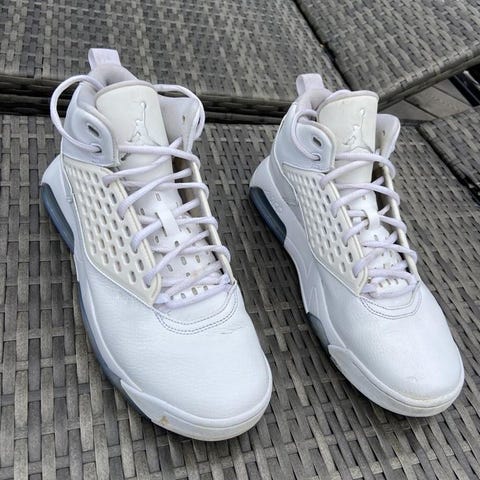 Air Jordan sneakers i storlek 42,5. Skorna har överdel i grå ton med gröna detaljer på plös, häl och innerfoder. Klassisk snörning framtill och vadderad krage för stabilitet runt ankeln. Sulan är i mörkare grå nyans med synlig luftkudde i hälen. Passar som vardagsskor eller till fritidsaktiviteter.
