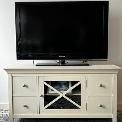 Fin vit TV-bänk. Några små ställen där den vita färgen är bortnött.