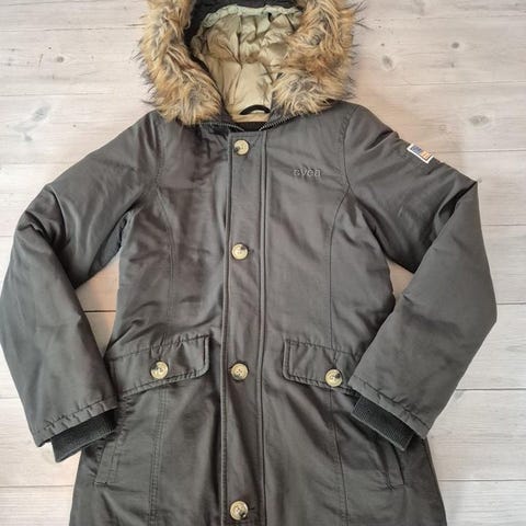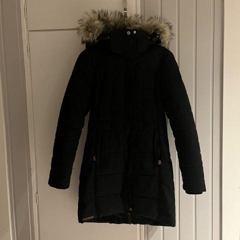 Svart, varm och vattentålig damjacka i storlek L, lång modell. Jackan har huva med pälsimitation och dragkedja framtill. Passar som vardagsjacka under kallare säsonger. Hämtas i Spånga, swishbetalning.