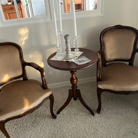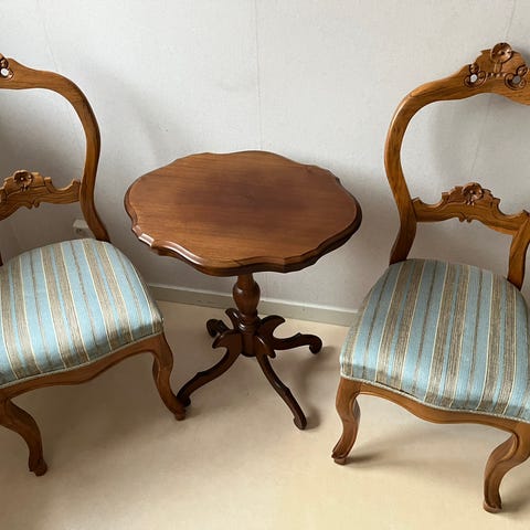 Soffgrupp bestående av två fåtöljer och ett runt soffbord i trä. Fåtöljerna har stoppad sits och rygg i brun/gul klädsel med träram och armstöd. Soffbordet är runt med svarvad fot i mörkbetsat trä. (Mattan ingår inte)