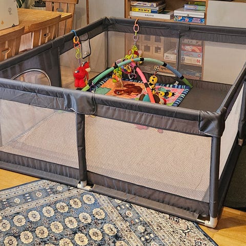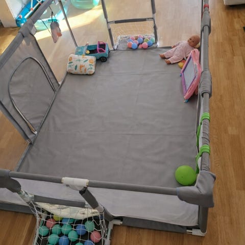 Säljer en rymlig och stabil lekhage i grått meshtyg. Perfekt för en trygg lekyta. Kommer från ett helt rök- och djurfritt hem.