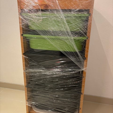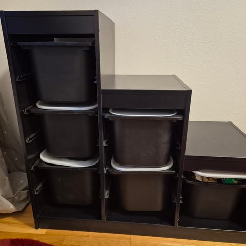 Säljer en IKEA Trofast förvaringsmöbel med plastbackar (de stora är grå och de små är