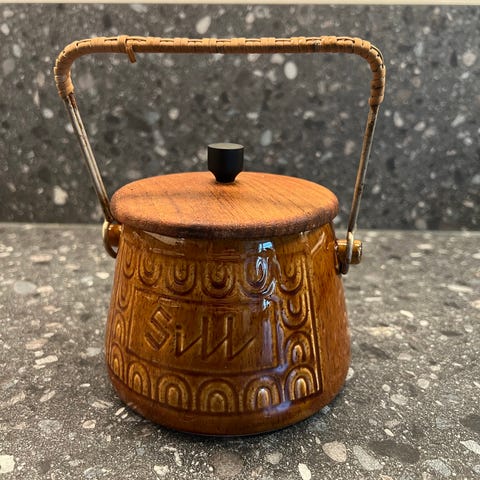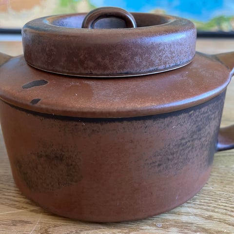 Tekanna i brun keramik med handtag i flätad design. Passar för servering av te eller andra varma drycker. Flameldfast. Enkel, funktionell form.