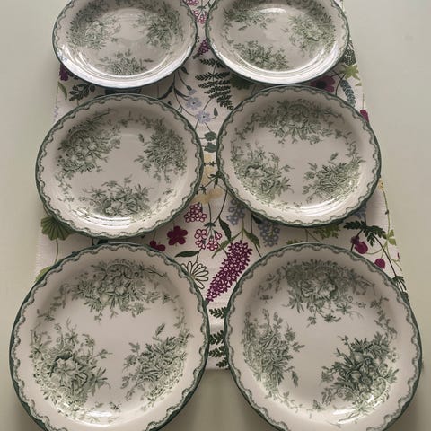 Rosenthal Maria porslinservis i vitt med dekor i form av grå blad och lila bärmotiv. Servisen består av assietter, tallrikar, djupa tallrikar och avlånga serveringsfat med åttakantig form och reliefkant. Passar som middagsservis och serveringsporslin för vardag och fest.