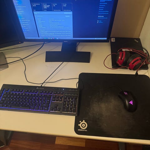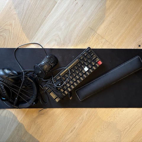 bilderna inkluderar ett trådbundet tangentbord, en trådlös mus, ett par over-ear hörlurar med kabel, en bordsmikrofon med justerbart mikrofonstativ samt en stor musmatta. Utrustningen är lämplig för allmän datoranvändning, spel och röstkommunikation. Exakta modeller, tekniska specifikationer och mått framgår inte av bilderna. Skriv gärna lättast att få tag på mig