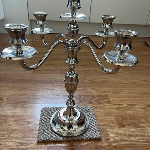 Femarmad kandelaber/ljusstake silverfärgad. Osäker på vilket material den är gjord av