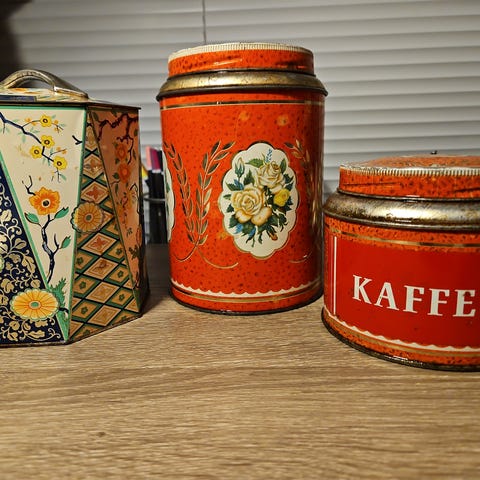En samling gamla burkar i plåt och papp. Blandat skick.