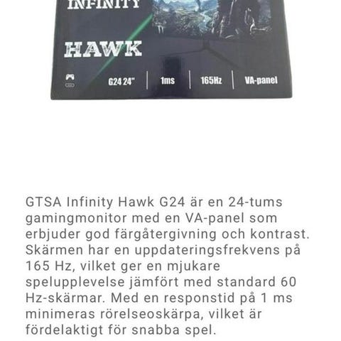 GTSA Infinity Hawk datorskärm med 24-tums skärmstorlek i svart utförande. Skärmen har VA-panel, Full HD-upplösning, uppdateringsfrekvens på 165 Hz och 1 ms responstid. Lämplig för användning med stationär dator, exempelvis för spel och allmän datoranvändning.