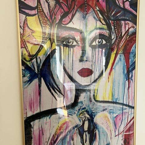 Tavla med fotokonst föreställande en person stående med ballonger. Motivet är inramat med en smal aluminium ram. och har en ljus passepartout runt bilden. Passar som väggdekoration i exempelvis vardagsrum