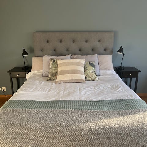 Säng i 3 delar och med tillhörande gavel i svart/grått tyg. Sängen har en hög, rak gavelform och består av två underdelar med en gemensam madrassyta ovanpå. Bra skick. Från 2018.