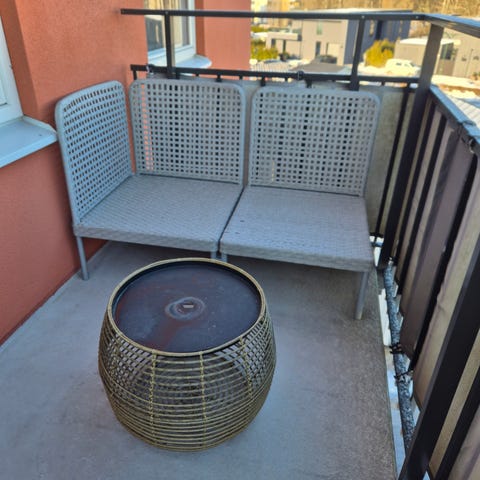 Perfekt för mindre balkong eller flexibel möblering. Nya dynorna syns på bild nr 2.