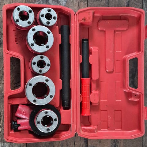 Gängsats för rörtappning med flera gänghuvuden i olika storlekar. Levereras i plastväska med handtag och separat handtag/skarvstång för användning av gänghuvudena. Lämplig för arbete med rördragning och gängning av rör i verkstad, bygg och VVS-arbeten.