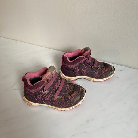 Yttermaterial i rosa textil med svart sula och mjukt, ljust foder på insidan.