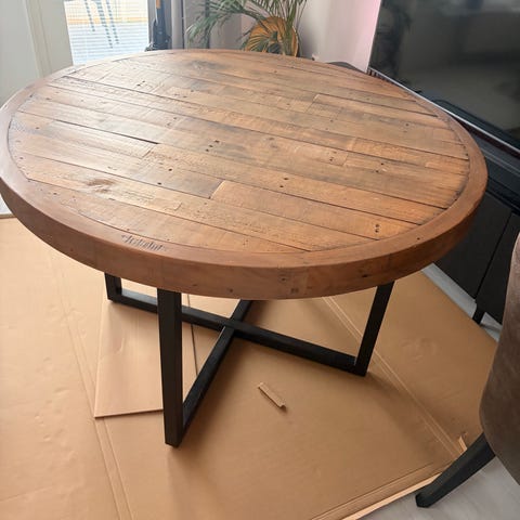 Matbordet är i svart trä, diameter 120 cm, använd med få repor (se bild).