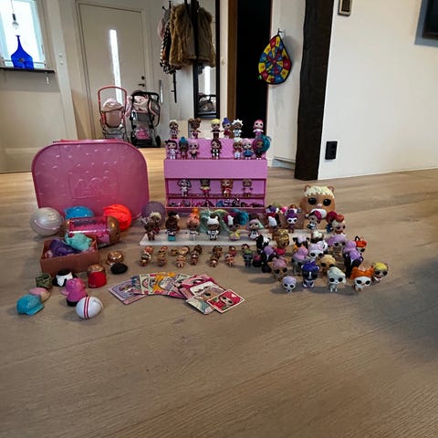 Stort L.O.L. Surprise paket med dockor och tillbehör. Innehåller flera samlardockor med olika utseenden samt tillhörande figurer och husdjur.