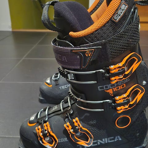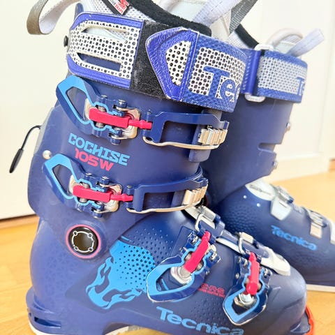 Tecnica Cochise Pro W alpina pjäxor i storlek 24/24,5 (290 mm sula). Pjäxorna har fyra justerbara spännen samt power strap upptill för bättre fixering av fot och underben.