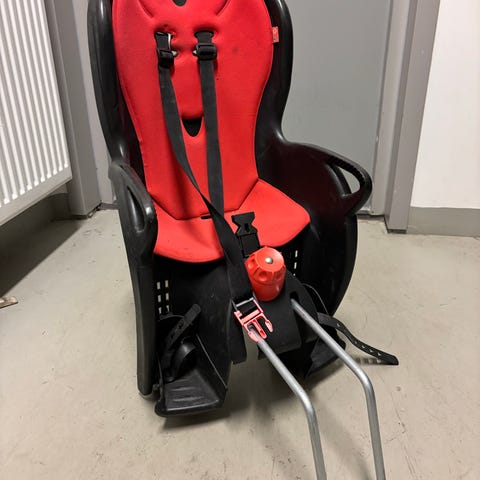 Cykelsits för barn med angiven maxvikt cirka 22 kg. Sitsen är i grå färg med svart innerdel och har bälte för att spänna fast barnet. Metallbyglar för montering på cykelns bakdel ingår. Avsedd för transport av barn på cykel, med stöd runt sidorna och vid benen för ökad stabilitet under färd.