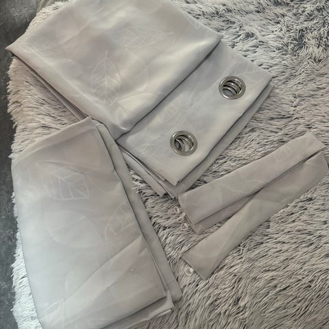 Jättefina långa beiga mörkläggningsgardiner, som nya.