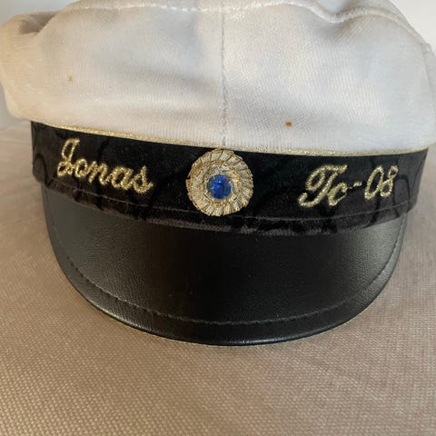 Sombrero i rött med guldfärgade detaljer och broderier. Hattens kant är dekorerad med ett guldfärgat band. Sombreron har en hög, rundad kulle och en bred, uppåtböjd brätte.