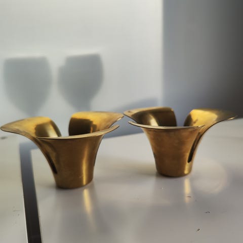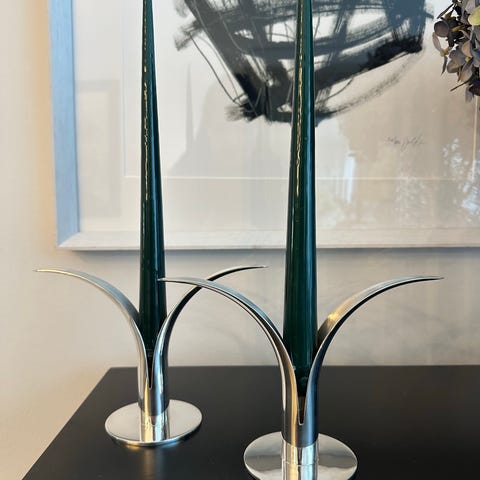Säljer ljusstakar från Ystad metall, modell liljan. Detta är originalet som Sverige visade upp på världsutställningen i New York. Numera även nyproducerad av Skultuna. Men dessa är gamla och stämplade som sig bör, IÅB och Ystad metall.