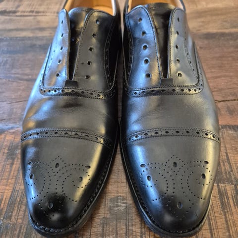Myrqvist finskor i svart färg, storlek 42. Klassisk modell med broguemönstrad ovandel och gummisula. Skorna är avsedda som herrskor och passar för användning vid exempelvis kontor eller mer formella tillfällen.
