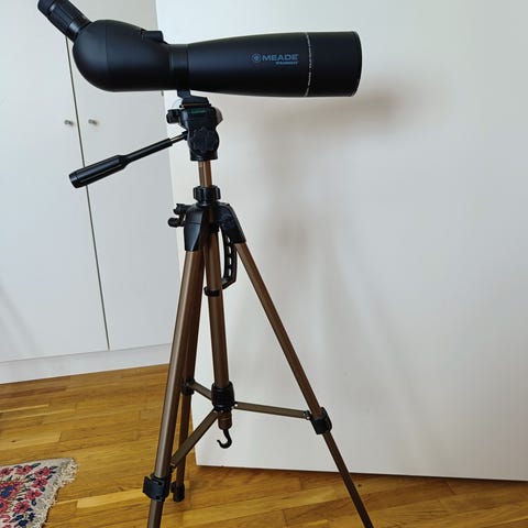 Kikaren står monterad på ett Manfrotto 290 stativ med tre ben och justerbar höjd. Stativet har snabbplatta och huvud anpassat för att bära optik som tubkikare eller kamera.