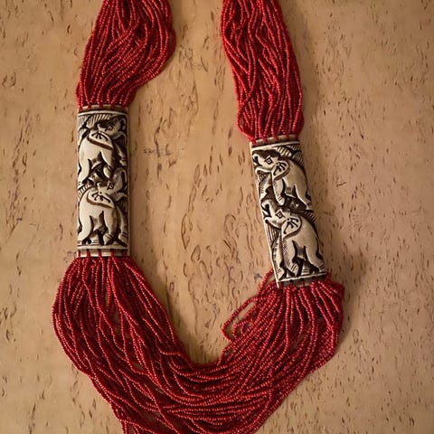 Halsband i flerfärgad design. Består av två liknande halsband med små, runda delar trädda på snöre. Passar som enkel smyckesdetalj till vardag eller fest.